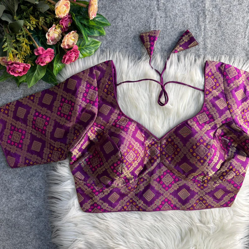 Crafted in heavy Jacquard silk, this Banarasi Patola-style blouse blends traditional weaving with a refined partywear silhouette. The rich texture and classic pattern make it…