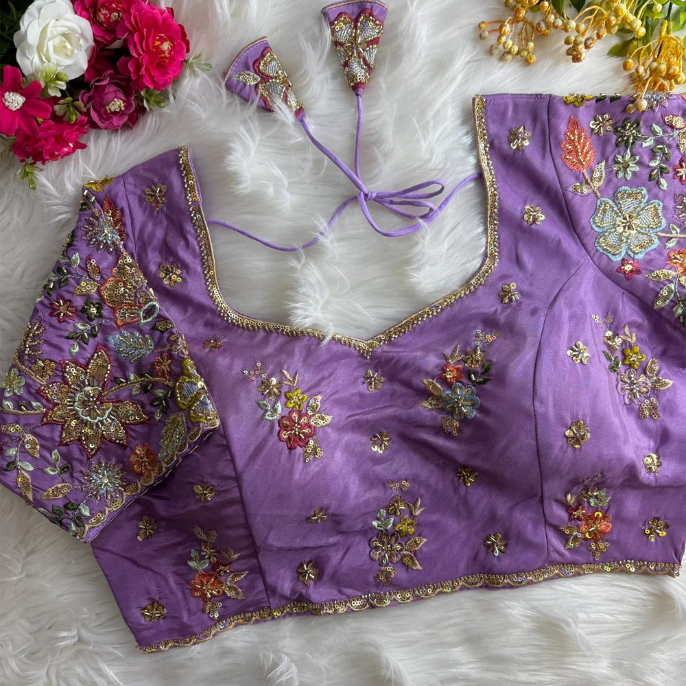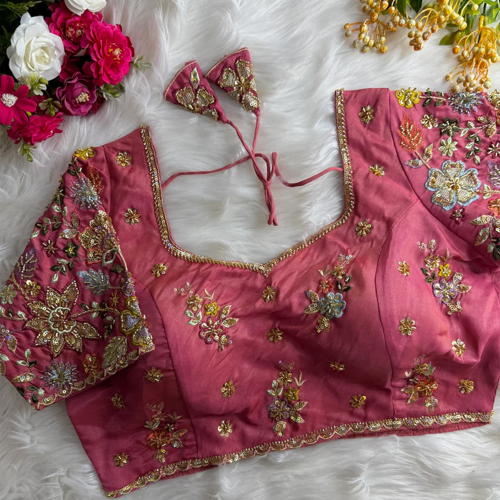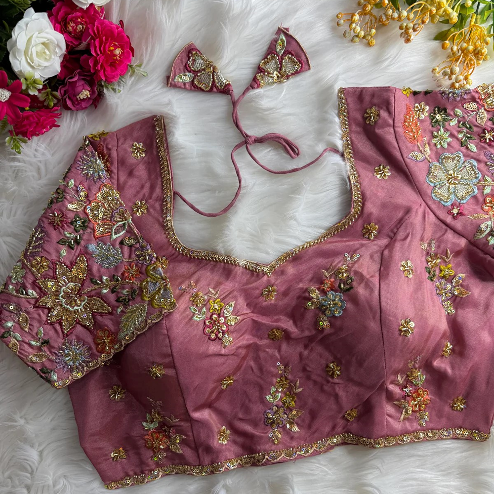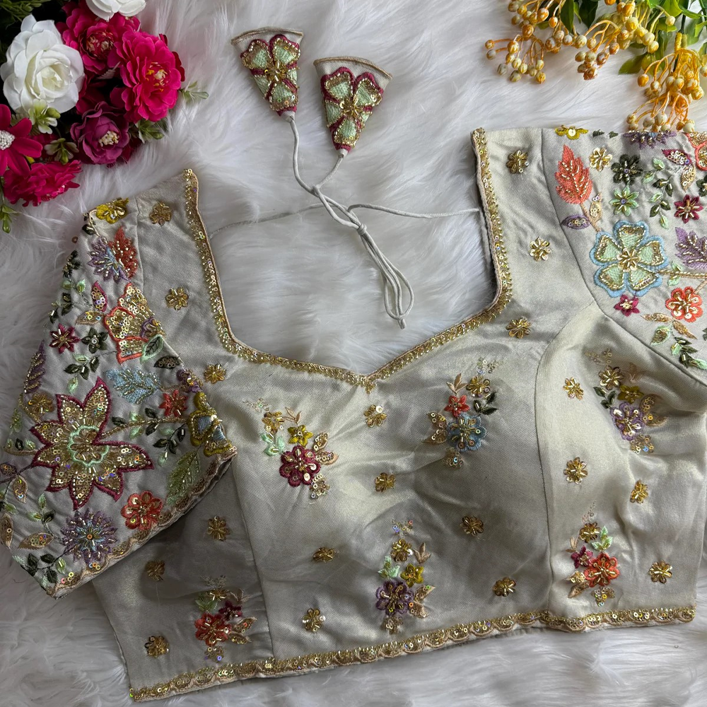 Crafted in luxurious Pure Cosmos Silk, this designer blouse features intricate handwork beautifully detailed across the sleeves and body. Elegant, refined, and celebration-ready it’s the kind of blouse that elevates even the simplest saree into a statement look.
