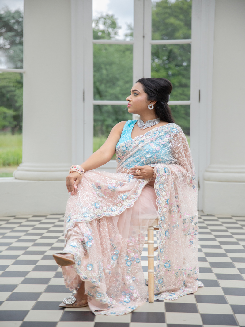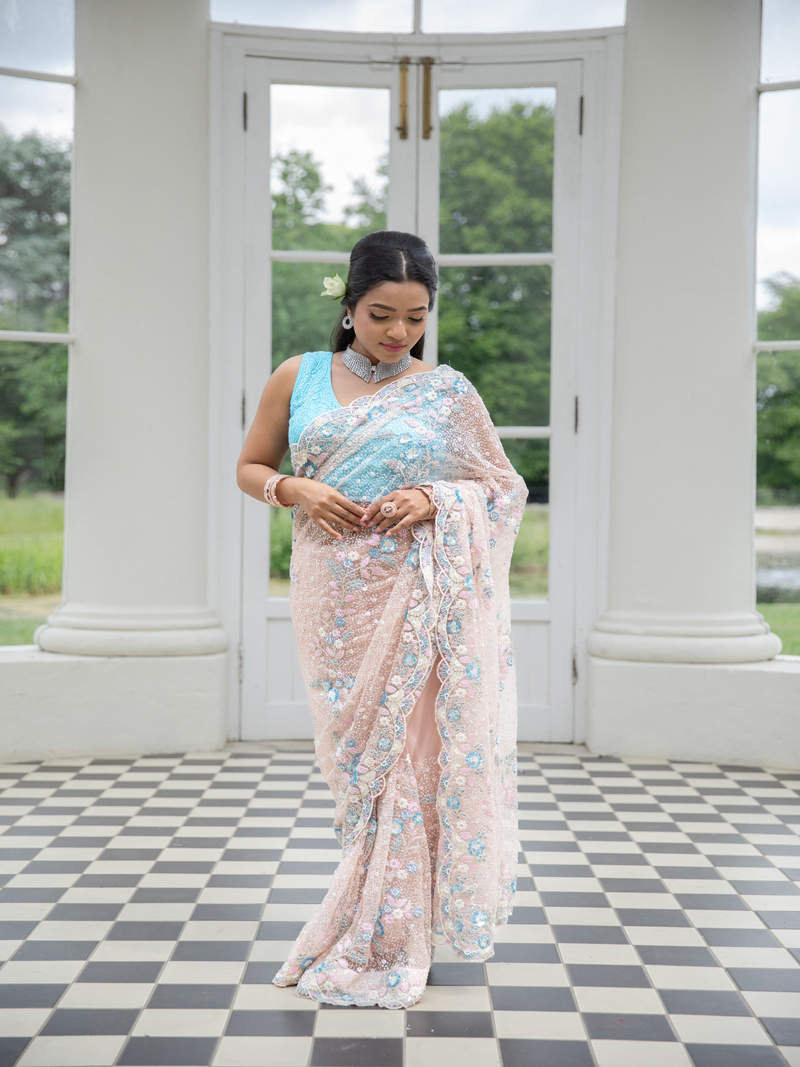 Work: Pastel blue, pink, and silver floral embroidery with sequins