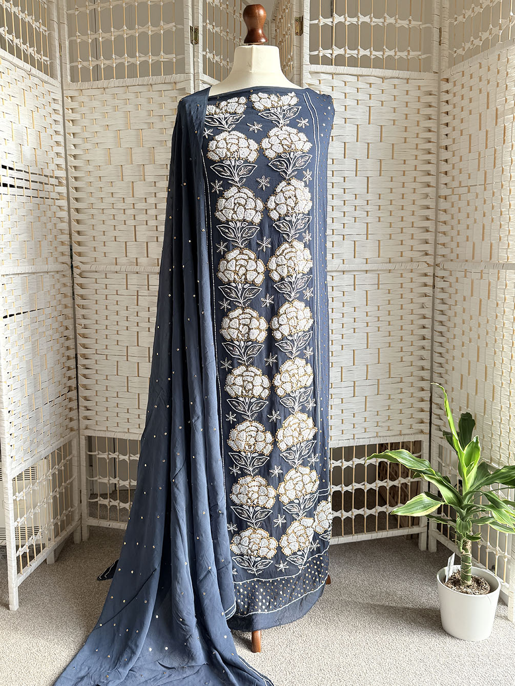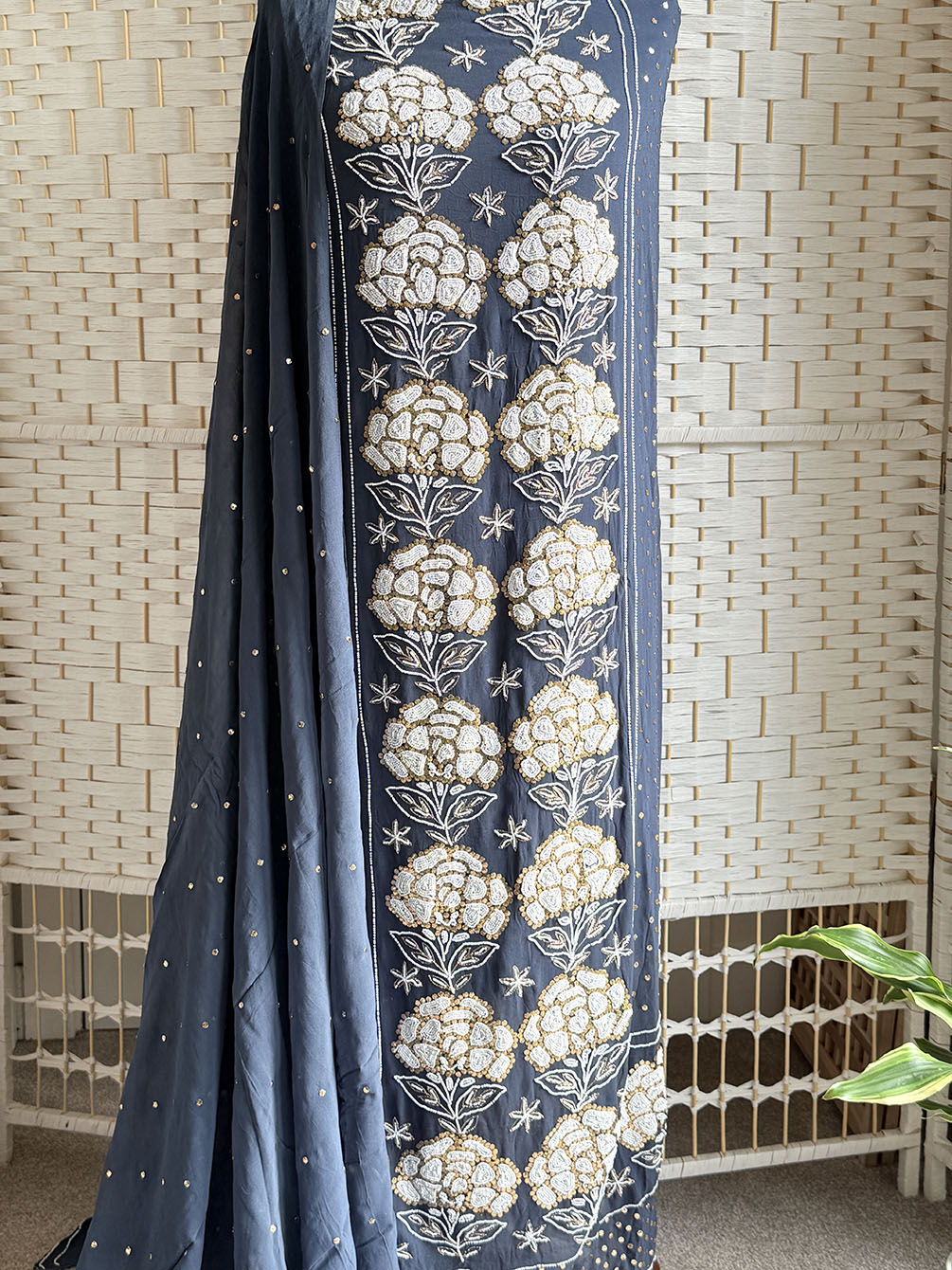 Elegance woven in heritage this deep charcoal blue suit celebrates the timeless craft of Kaamdani (also known as Mukaish and Badla work). Hand-detailed with pearl and metallic thread accents, it carries a quiet shimmer that feels regal yet understated.