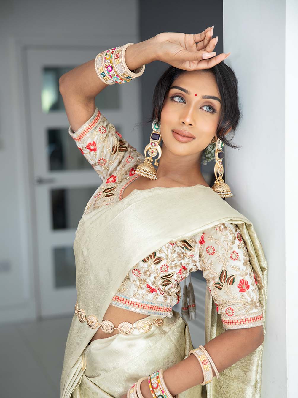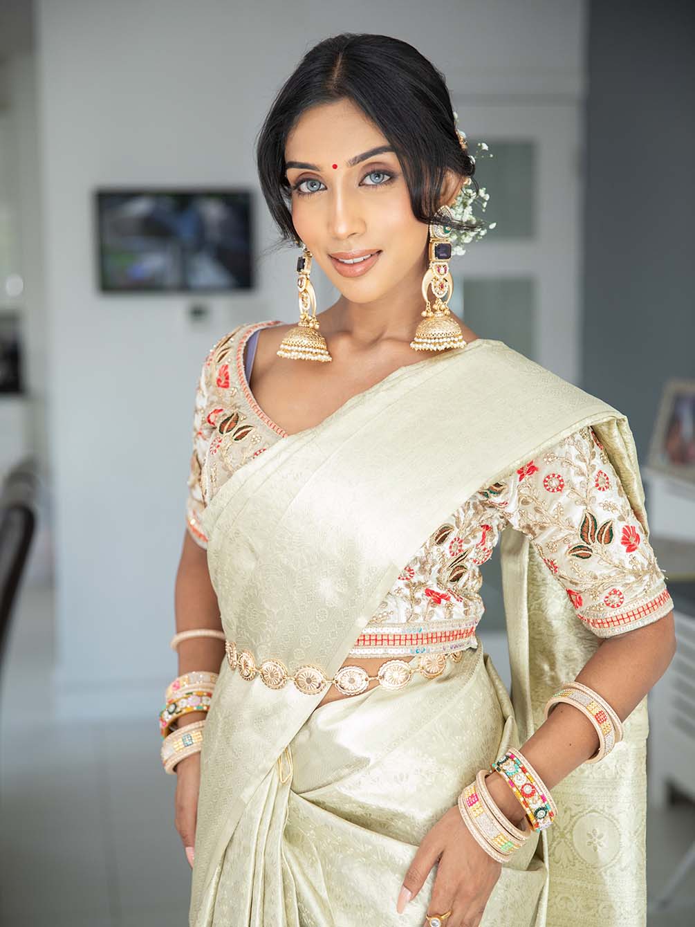 Finished with fall and pico, it’s ready to drape and comes with an unstitched blouse piece, allowing you to style it in your own way minimal, bridal, or modern classic.