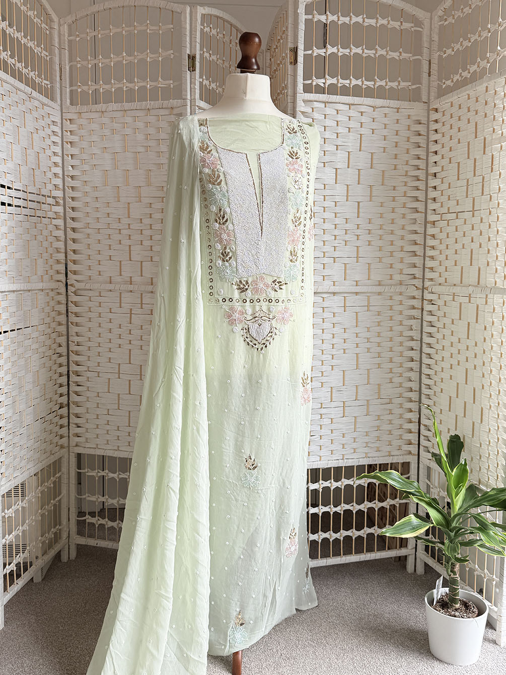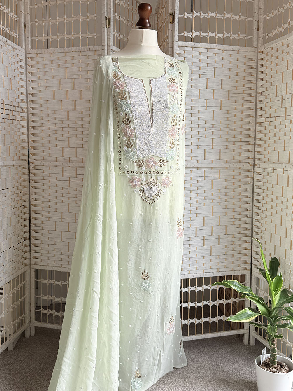 A symphony of softness and detail this mint green suit radiates effortless grace. Hand-embellished with real mirror, pearl, and Cut Dana work, it carries the delicate artistry of Chikankari with a touch of contemporary shimmer.