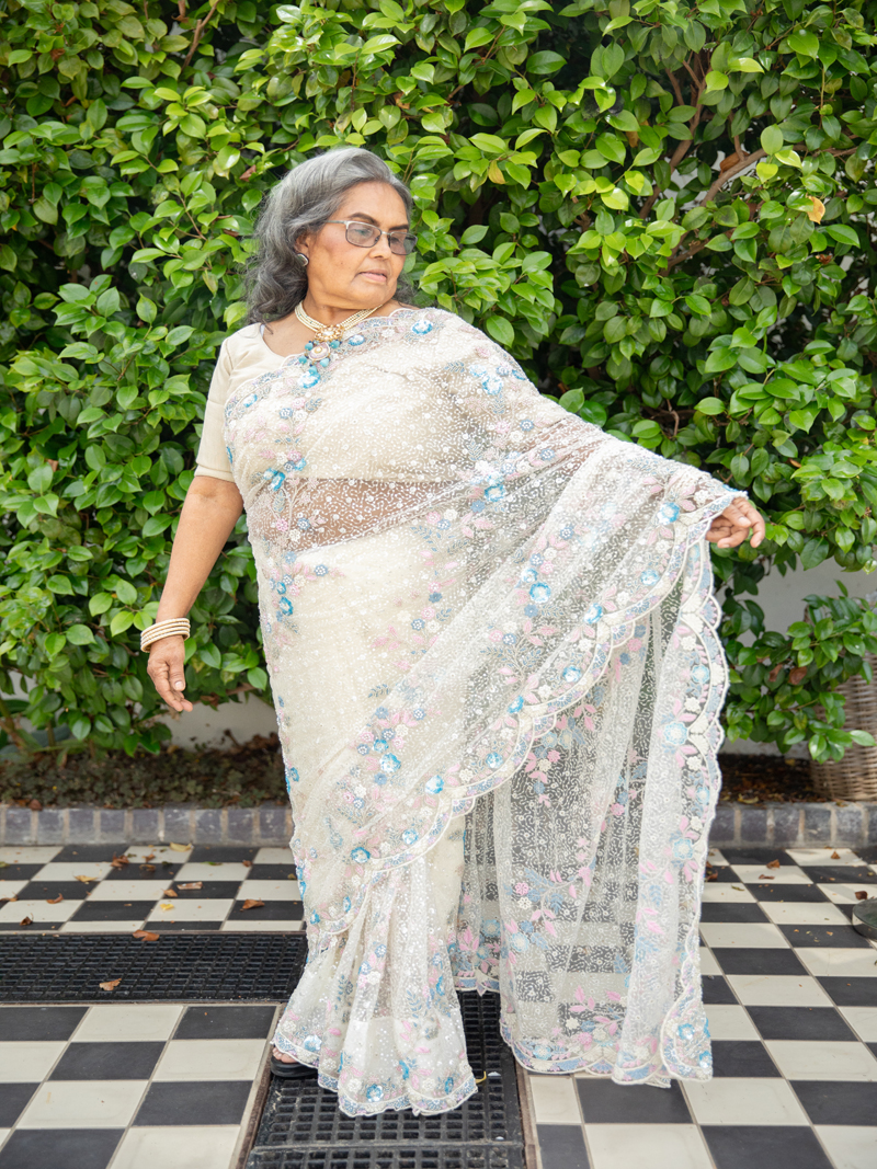 Work: All-over multicolour thread and sequin embroidery with scalloped edging