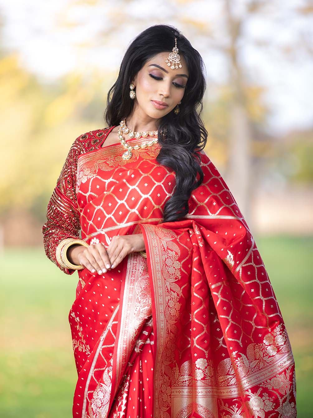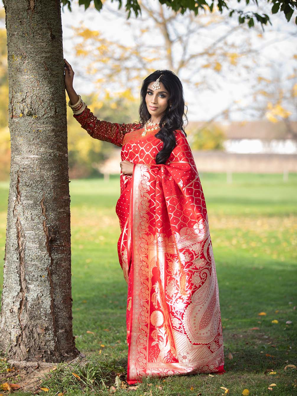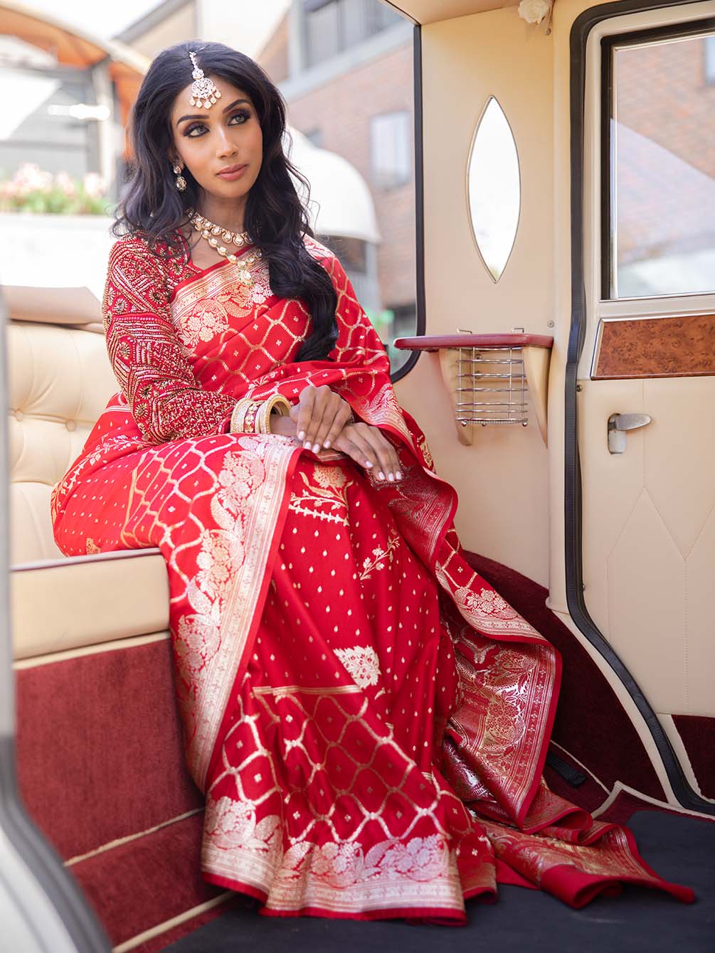 Woven in pure Mashru Banarasi silk, this piece carries an unusual weave pattern that sets it apart from the traditional grid rare, luminous, and effortlessly elegant. The luxurious red drape is kissed with zari detailing that glows softly rather than gleams loudly.