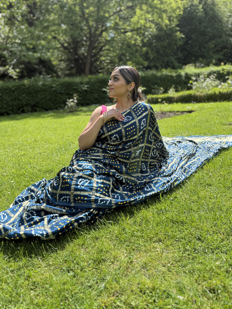 Work: Traditional Bandhani (tie-dye) with geometric and dotted detailing