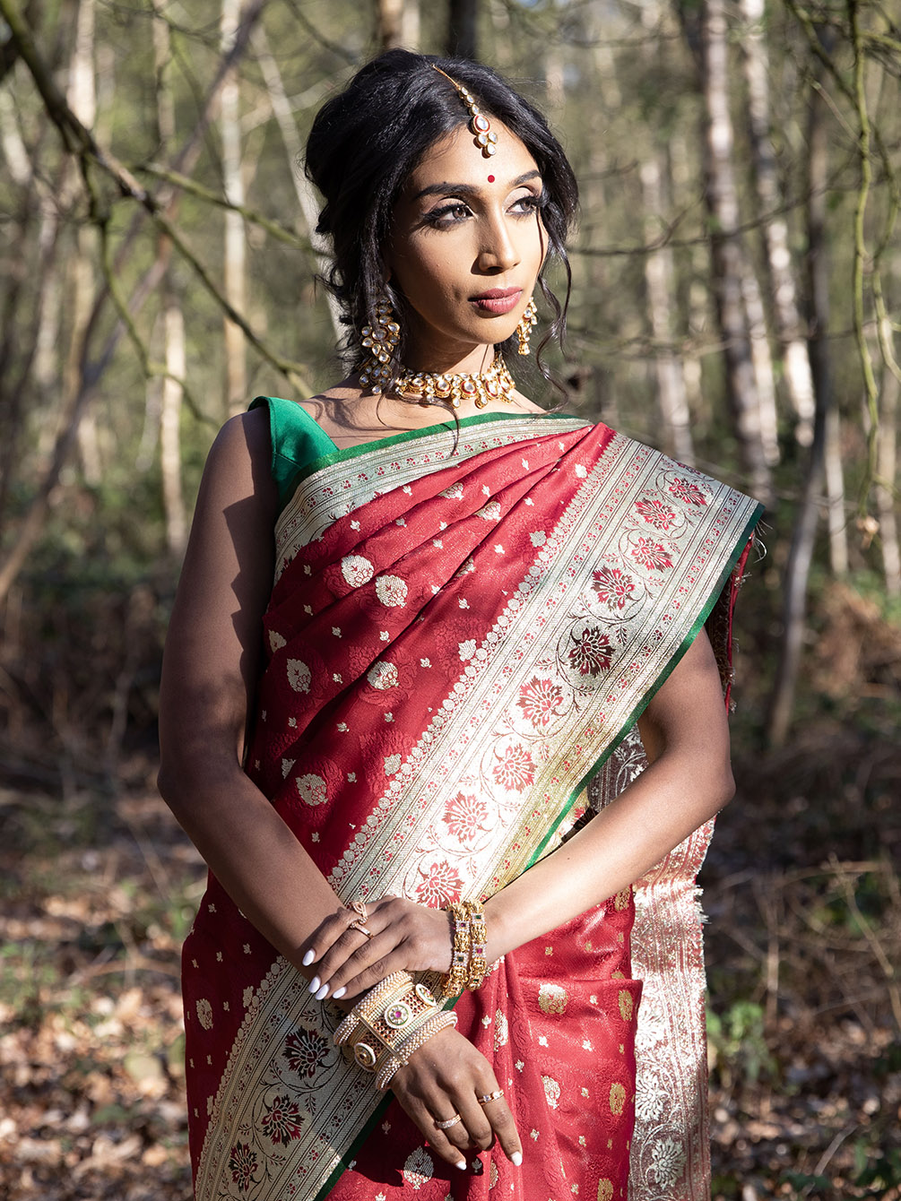 This Mashru Banarasi Silk saree is woven with a gentle sheen and the signature softness that makes Mashru so loved. The classic red base is adorned with delicate zari motifs and a contrasting border that adds a regal finish timeless yet light to wear.