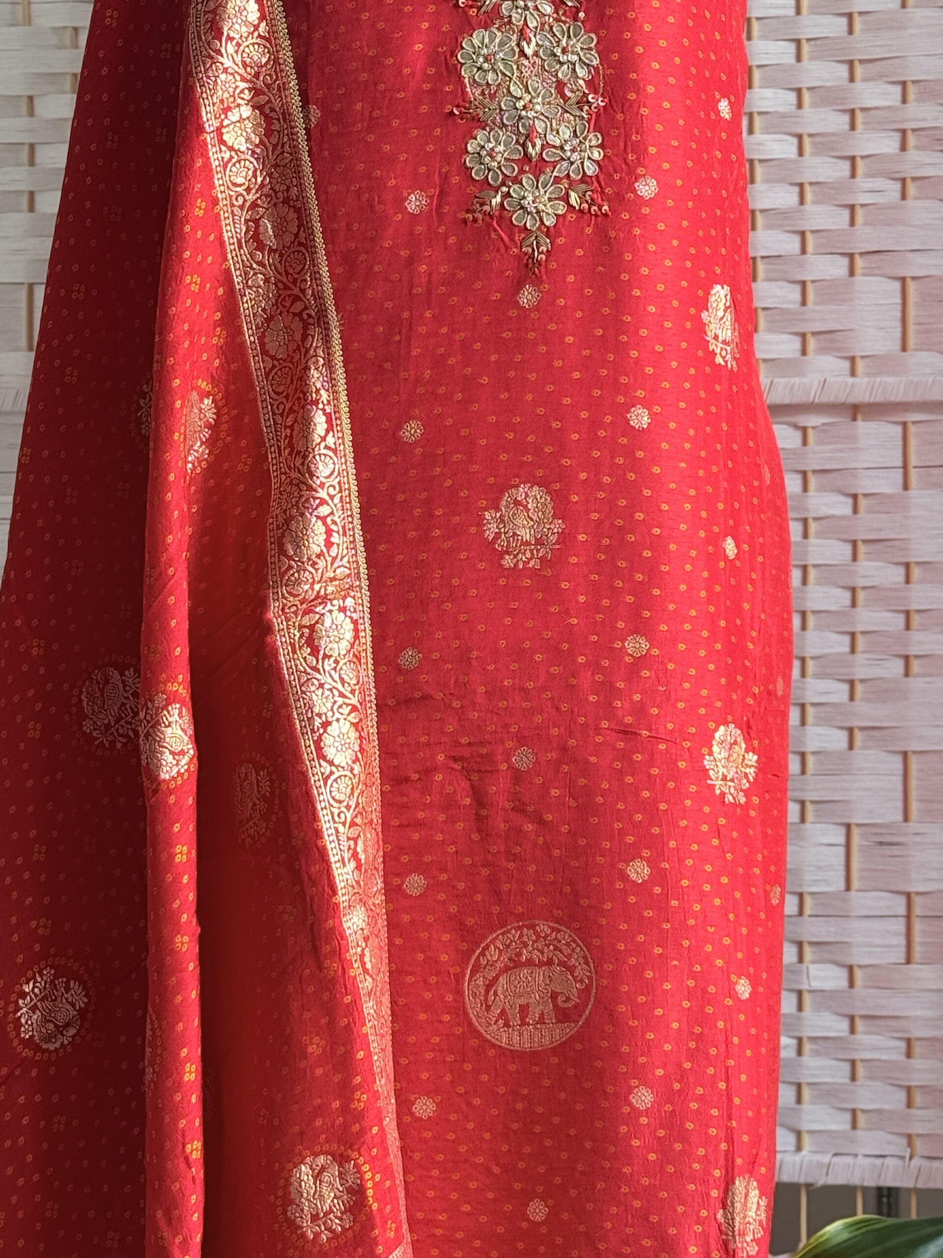 A masterpiece of tradition and artistry this pure Banarasi silk suit features a delicate Bandhani-style weave, brought to life through the richness of zari and intricate gota handwork along the neckline. The vibrant red hue carries the warmth of celebration, while the woven motifs including traditional elephant and floral patterns — add depth and character to the fabric.