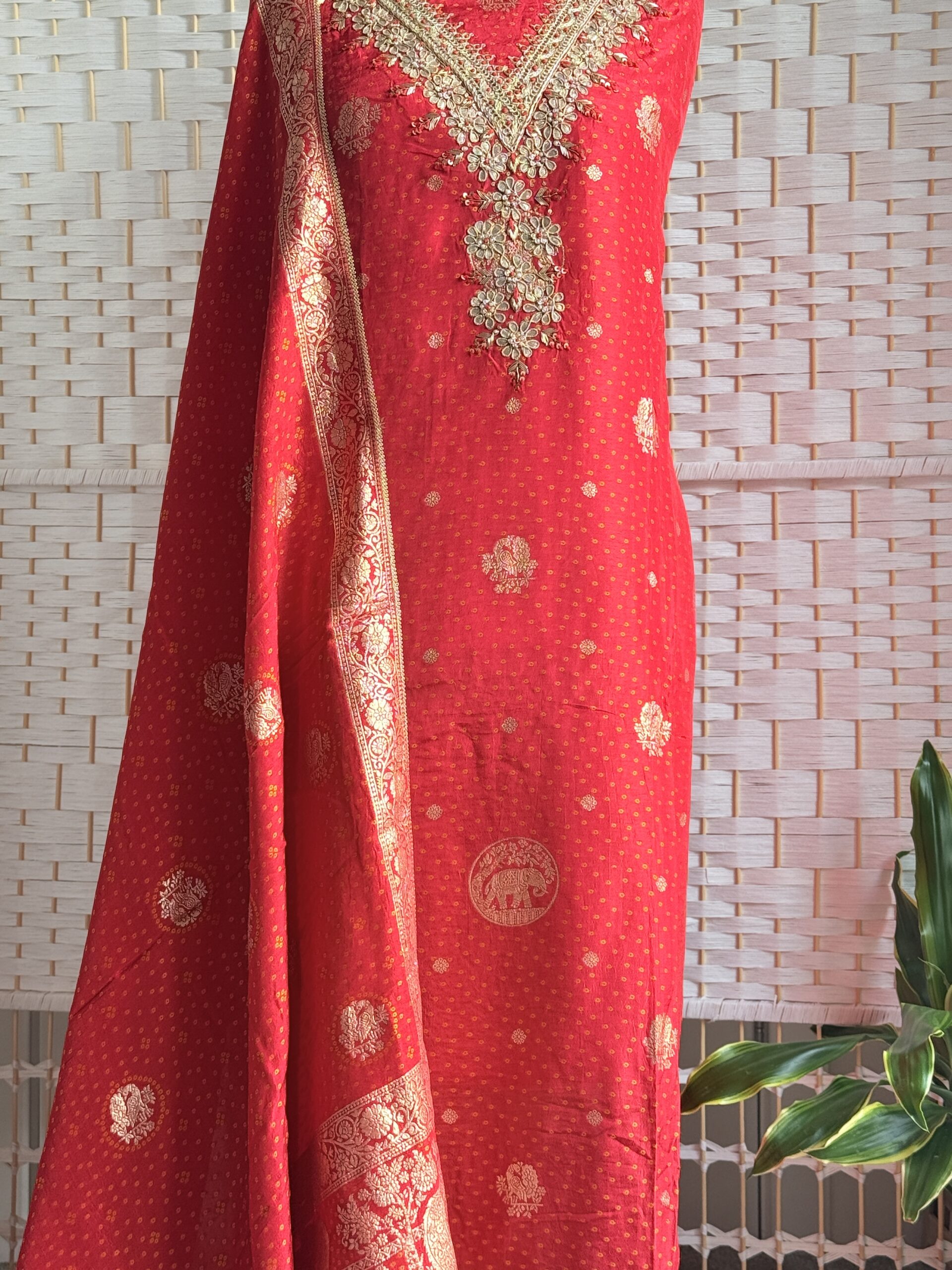Unstitched | Banarasi Silk | Bandhani-Style Weave with Gota Work | Includes Dupatta, Lining & Bottom