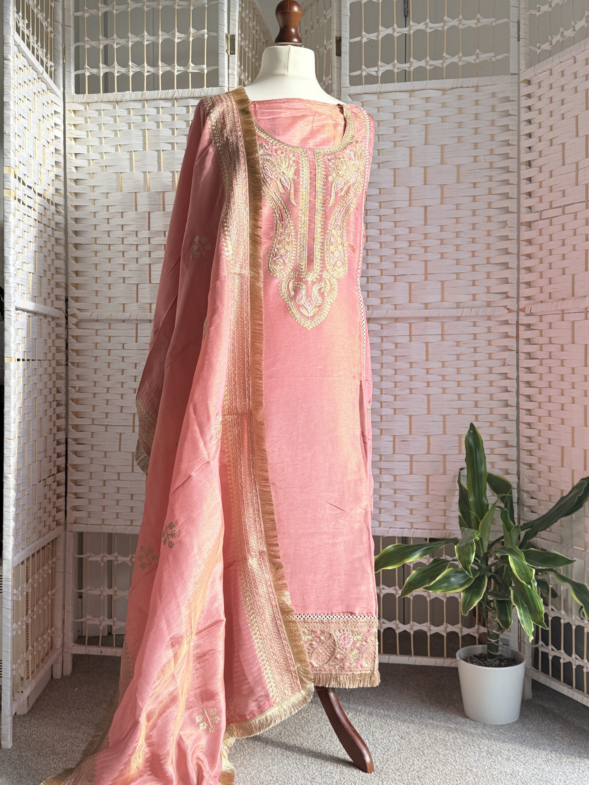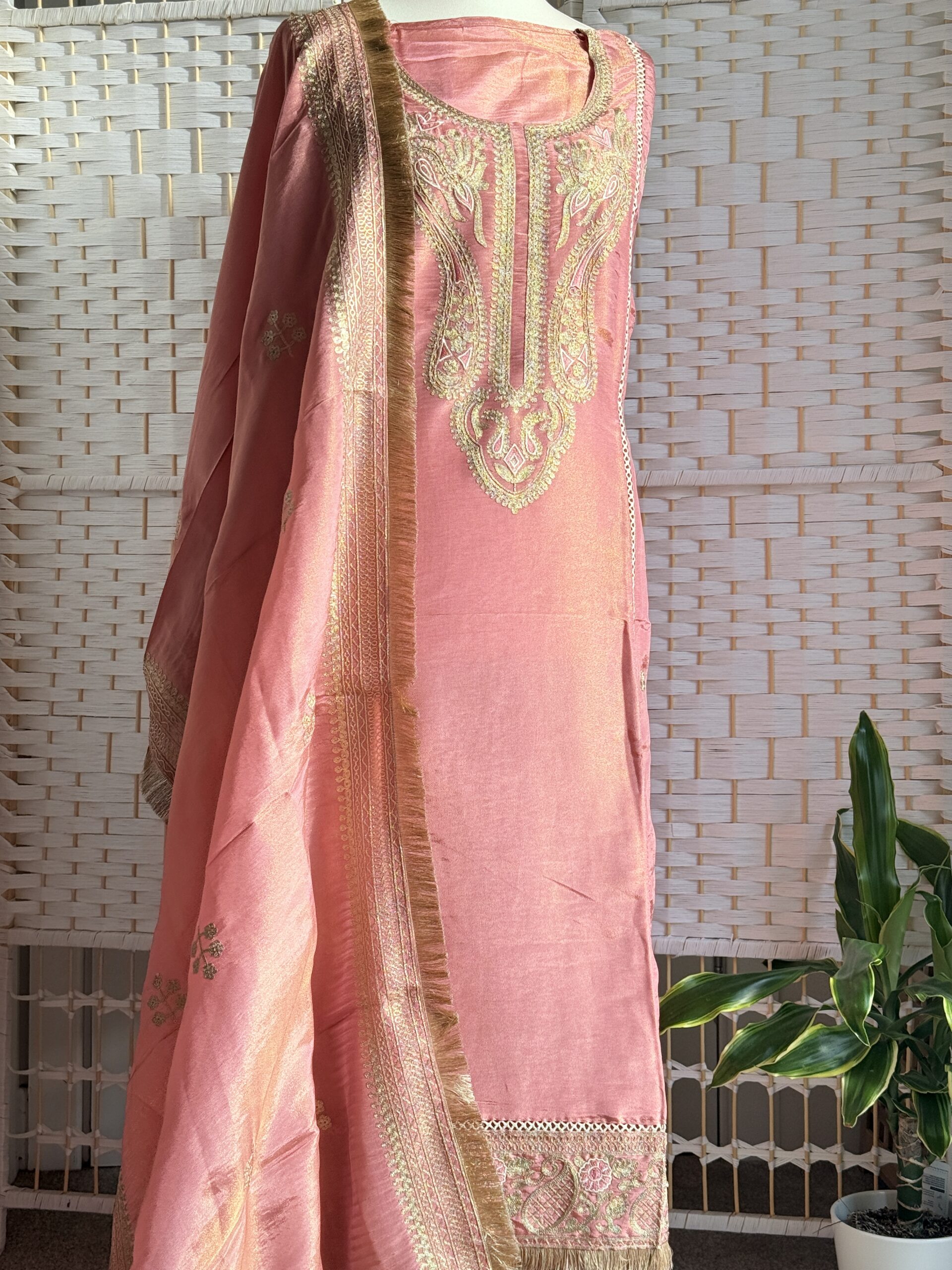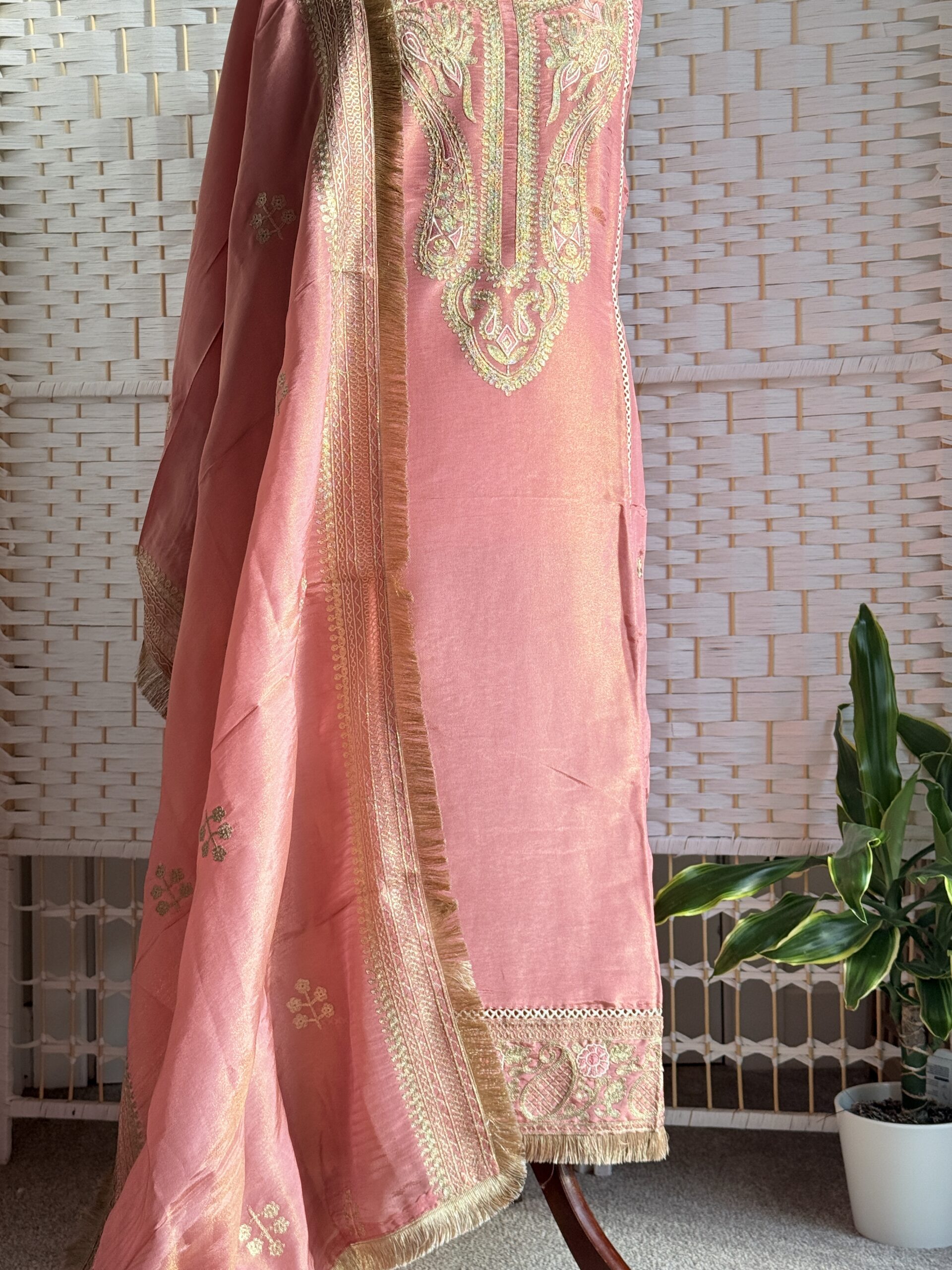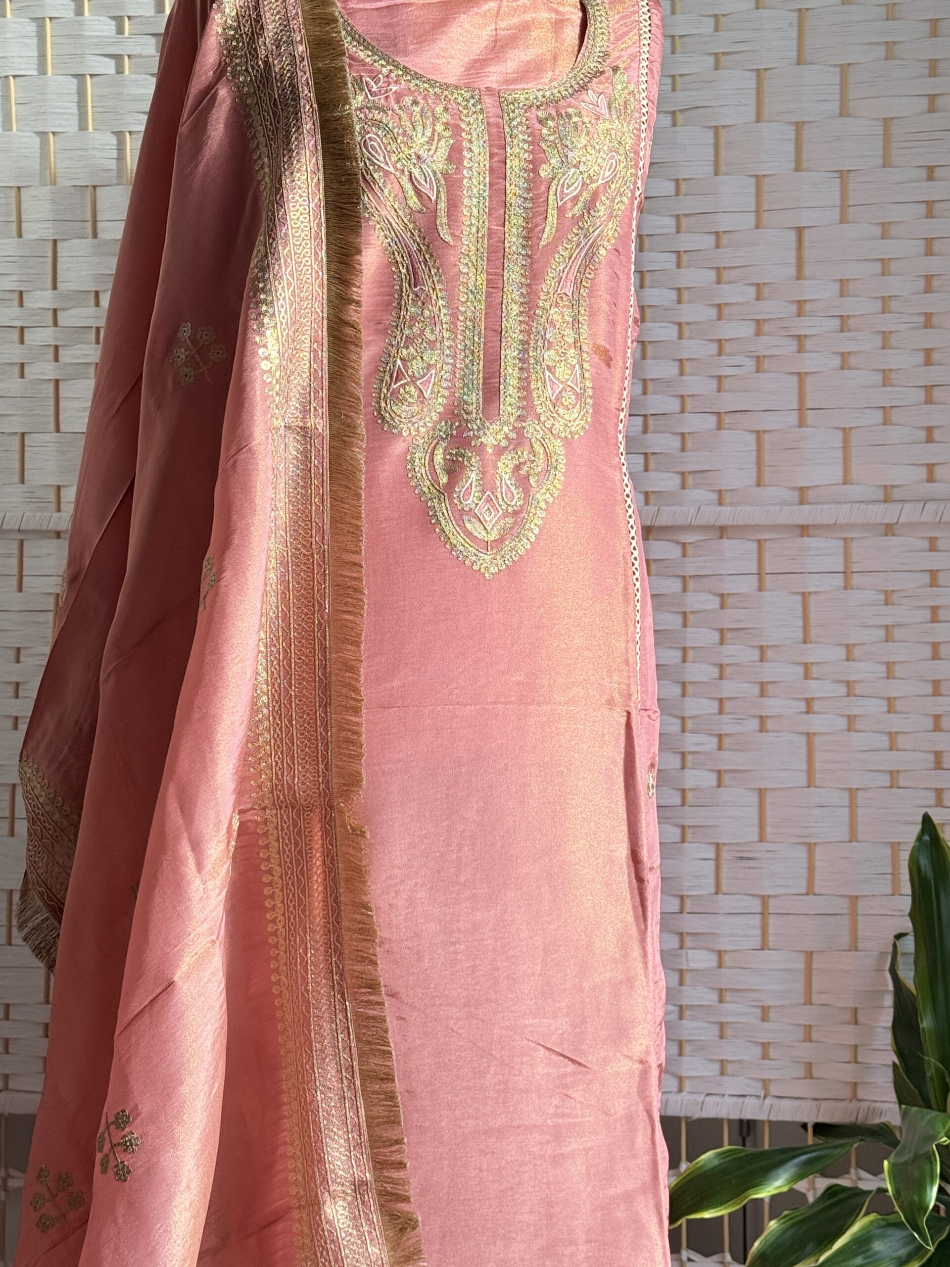 Radiant, refined, and rich in craftsmanship this blush rose pure Banarasi shimmer tissue suit is a timeless expression of elegance. The fabric carries a natural sheen that glows softly in the light, while the neckline is detailed with intricate thread embroidery in zari tones, showcasing delicate artistry and heritage precision.